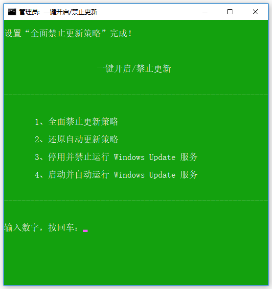 雙擊運(yùn)行批處理,只需要按【1】并按回車即可禁用自動(dòng)更新,如果需要打開自動(dòng)更新時(shí),只需要按【2】并按回車即可,前兩項(xiàng)設(shè)置是不會(huì)影響“自動(dòng)更新服務(wù)”的,一般也沒必要禁用它,因?yàn)槿绻?ldquo;自動(dòng)更新服務(wù)”會(huì)導(dǎo)致微軟商店無(wú)法安裝APP軟件,只要設(shè)置了【1】系統(tǒng)就不會(huì)自動(dòng)更新,如果你不使用應(yīng)用商店,可以同時(shí)執(zhí)行【3】。
