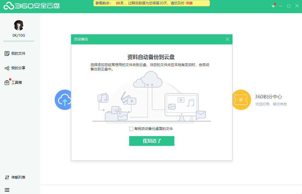 360安全云盤為每個(gè)新用戶免費(fèi)提供10G的初始試用容量空間,通過簡(jiǎn)單付費(fèi)購買可以擴(kuò)容到更大空間,足夠存放您海量工作文檔、珍貴照片或流行歌曲,滿足日常所需。