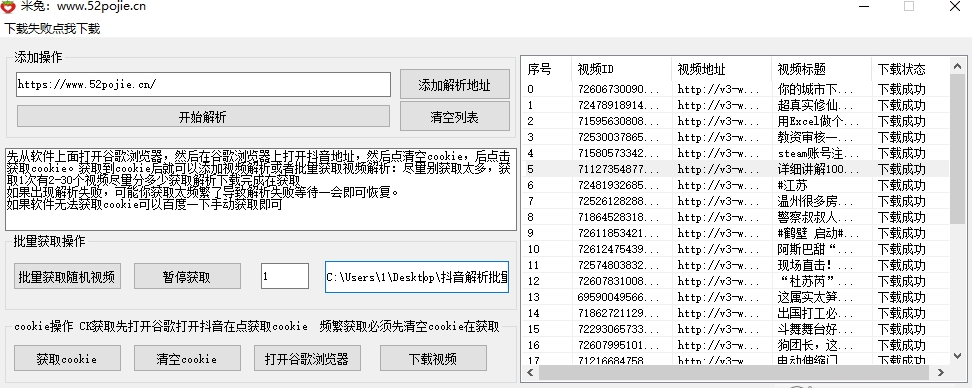 先從軟件上面打開谷歌瀏覽器,然后在谷歌瀏覽器上打開抖音地址,然后點清空cookie,后點擊獲取cookie。獲取到cookie后就可以添加視頻解析或者批量獲取視頻解析:盡量別獲取太多,獲取1次有2-30個視頻盡量分多少獲取解析下載完成在獲取