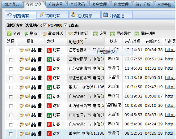呼叫可以監(jiān)視訪問(wèn)者的IP、地區(qū)、來(lái)源頁(yè)面、關(guān)鍵詞、訪問(wèn)時(shí)間、在線時(shí)間、訪問(wèn)頁(yè)面、訪問(wèn)次數(shù)和閱覽頁(yè)面,全面實(shí)時(shí)控制顧客信息。