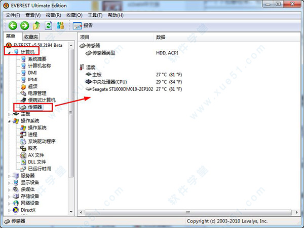 還是在“計算機”里,點擊“傳感器”即可詳細顯示主板、CPU、硬盤的溫度及CPU的電壓。非常方便!其實我用此版本的EVEREST Ultimate Edition 時候,這些溫度在電腦的任務欄有顯示的!