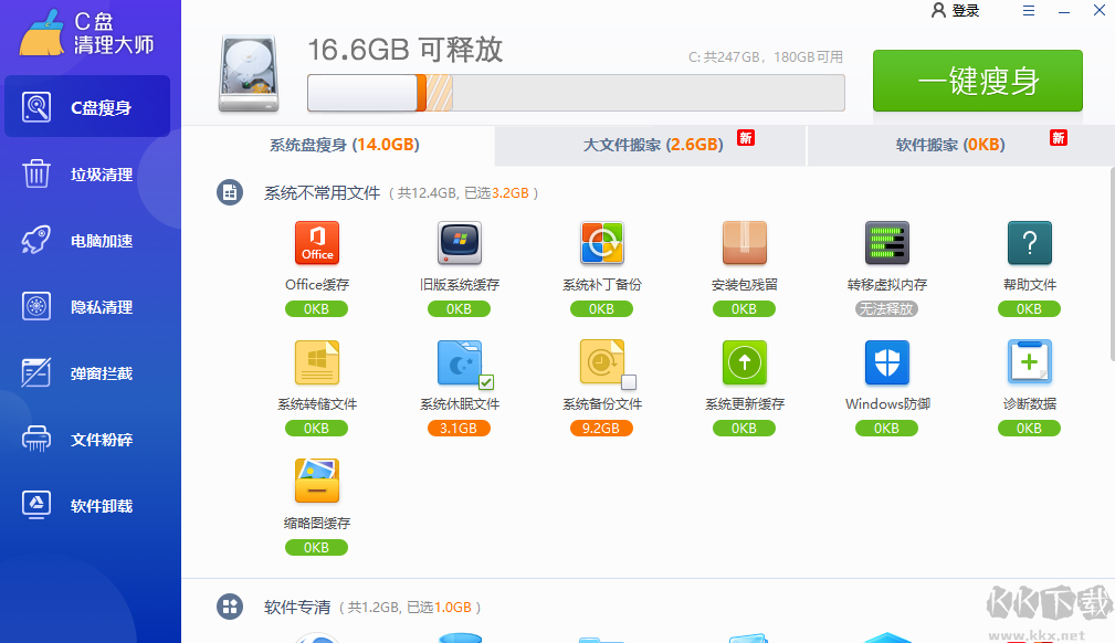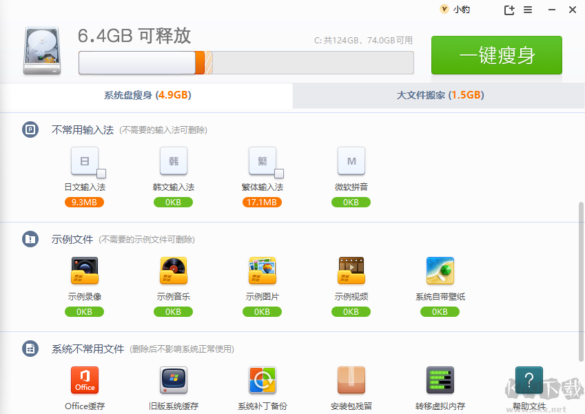 C盤瘦身專家是一款專業(yè)釋放電腦系統(tǒng)盤空間的工具??焖偾謇硐到y(tǒng)虛擬內(nèi)存、系統(tǒng)補丁備份、軟件緩存等系統(tǒng)不常用文件;智能檢測占用C盤的大文件,并搬移至其他磁盤。簡單操作,一鍵加速電腦,解決各種因C盤滿了導致軟件無法使用的問題。