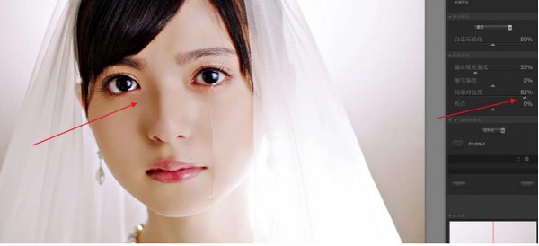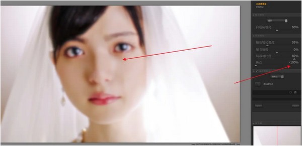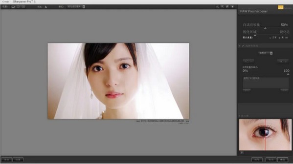 2、第二個(gè)滑塊為銳化區(qū)域和銳化邊緣,顧名思義,往左滑動(dòng)是對(duì)畫面的大塊區(qū)域進(jìn)行銳化,比如圖中的臉,而向右滑則是對(duì)畫面邊緣的部分進(jìn)行銳化,比如圖中婚紗的外輪廓。