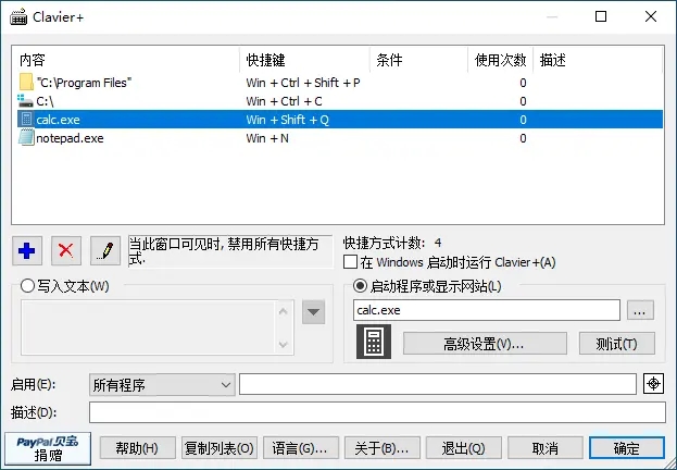 如果你不想Clavier+的快捷鍵替換了某些程序中的相同快捷鍵功能,那么你可以使用這個例外功能。你可以選擇“all program but”除了XX程序外其他軟件中都可以使用這個快捷鍵?;蛘?ldquo;only those programs”快捷鍵只在這些程序中有效。