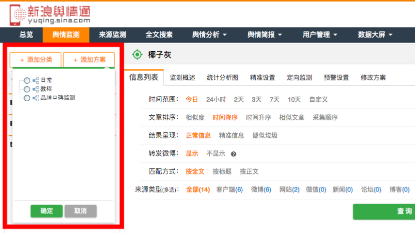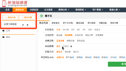 接下來(lái),就可以開始設(shè)置監(jiān)測(cè)方案了,點(diǎn)擊“添加方案”,在彈出的分類列表框內(nèi)選擇對(duì)應(yīng)的分類,點(diǎn)擊確定即可。其中,本處選擇“品牌口碑監(jiān)測(cè)”。