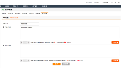 在彈出的頁(yè)面“新增方案”中,選擇“快速配置”或“高級(jí)配置”(“快速配置”適合初級(jí)用戶,“高級(jí)配置”適合高級(jí)用戶)。其中,本處選擇高級(jí)配置,設(shè)置方案名稱為“新浪輿情通”,匹配關(guān)鍵詞為“新浪輿情通+輿情監(jiān)測(cè)”,點(diǎn)擊保存。