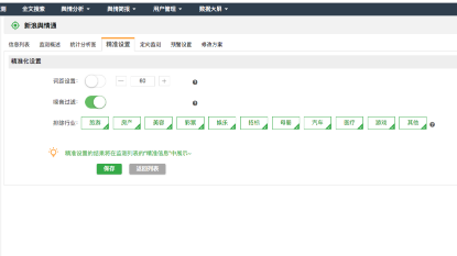 如果你發(fā)現(xiàn)信息列表所展示的信息不符合預(yù)期,則應(yīng)當(dāng)對(duì)監(jiān)測(cè)方案進(jìn)行修改,比如添加匹配關(guān)鍵詞或者排除相關(guān)關(guān)鍵詞。除此之外,你還可以點(diǎn)擊精準(zhǔn)設(shè)置,用設(shè)置詞距、噪音過(guò)濾、排除行業(yè)等方式進(jìn)行更為精準(zhǔn)的設(shè)置。