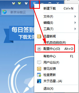 1、打開迅雷軟件,選擇右上角“菜單”選項(xiàng),在下拉菜單中選擇“配置中心”。