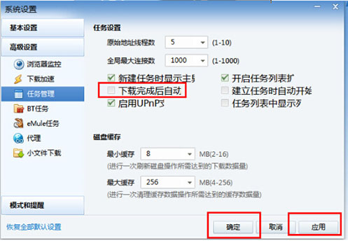 2、在打開窗口中選擇“高級(jí)設(shè)置”,然后選擇“任務(wù)管理”,找到“下載完成后自動(dòng)關(guān)機(jī)”并在前面打勾,然后點(diǎn)擊確定應(yīng)用按鈕就可以了。