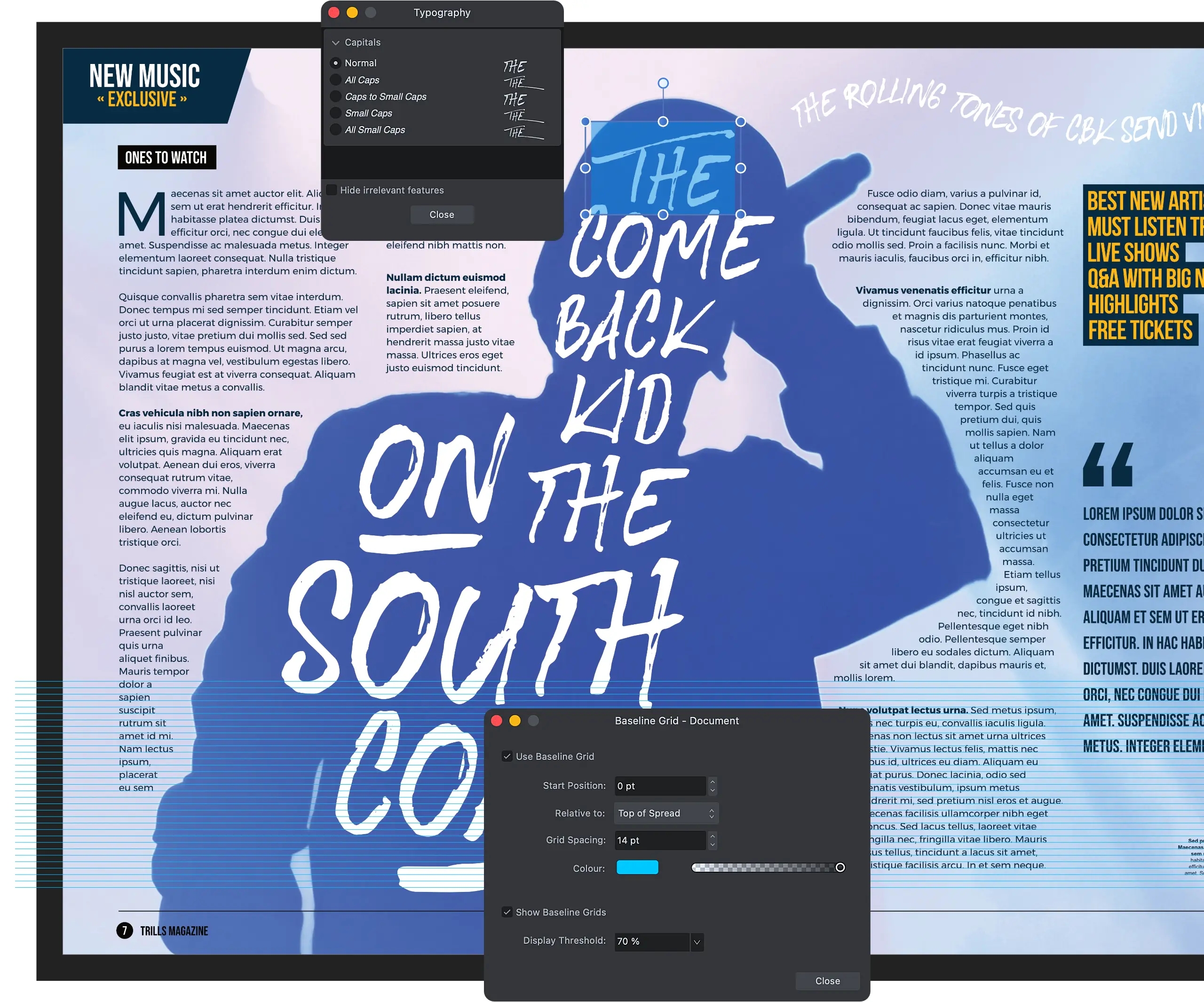擺脫令人厭倦的傳統(tǒng)文本布局的束縛。讓 Affinity Publisher 幫助您以創(chuàng)造性的新方式可視化文本,并在文檔中無縫流動(dòng)。