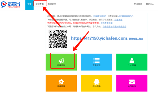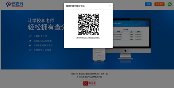 首先登陸易查分(登陸方式1:點(diǎn)擊頁面“登陸”按鈕,輸入用戶名和密碼登陸;登陸方式2:掃描二維碼直接登陸);