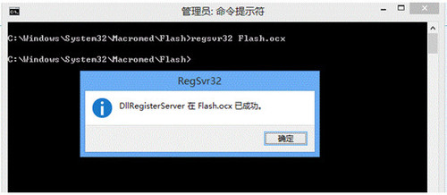 3、打開管理員的命令提示符,依次在WindowsSystem32MacromedFlash目錄下運(yùn)行regsvr32 Flash.ocx和WindowsSysWOW64MacromedFlash目錄下運(yùn)行regsvr32 Flash.ocx,注冊(cè)Flash