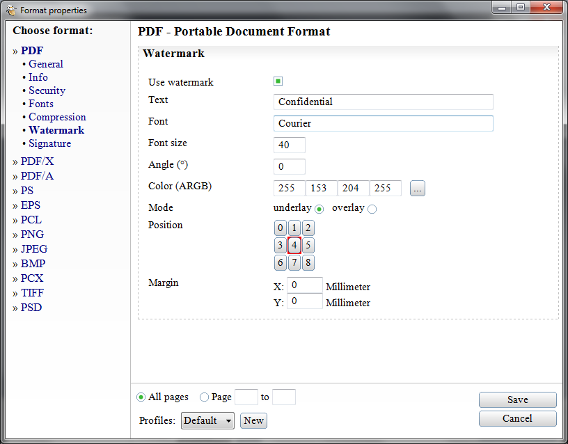 提供PDF元數(shù)據(jù)、密碼安全、壓縮和分辨率、水印和頁碼、底層和疊加層、附加、簽名等選項。