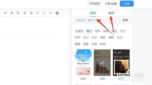 文章編輯完成后,點(diǎn)擊右側(cè)的模板與音樂(lè),可插入相應(yīng)的模板以及音樂(lè),選選中后即可預(yù)覽。