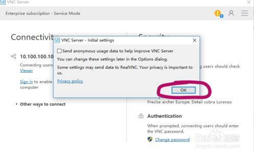 11、第一次使用 VNC Server時,要進行一些基本配置,安裝完 VNC Server后會進入它的主界面,這時會彈出一個首選項,為用戶體驗反饋設(shè)置,這里不要理會,直接點 OK