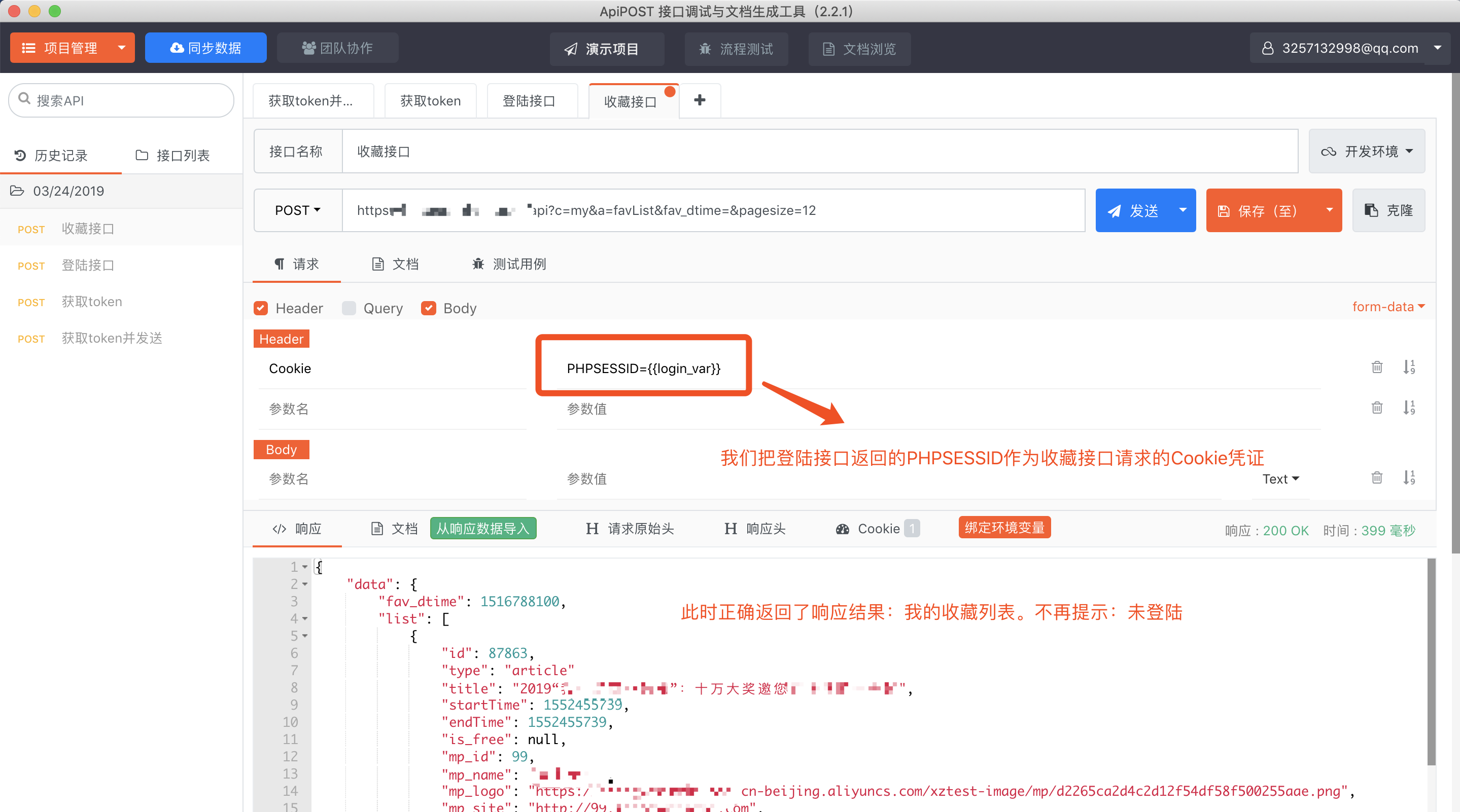 支持攜帶COOKIE請求:提供Cookie管理功能,可以攜帶自定義的Cookie進行模擬登錄,方便測試需要登錄訪問的API。