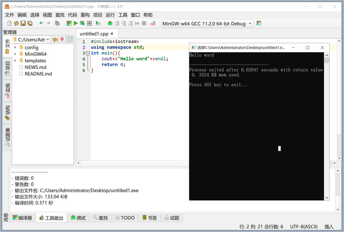 小熊貓C++無需復(fù)雜的安裝和配置,打開即可直接編輯程序文件;無需創(chuàng)建項(xiàng)目,點(diǎn)擊工具欄上按鈕即可編譯、運(yùn)行和調(diào)試程序。