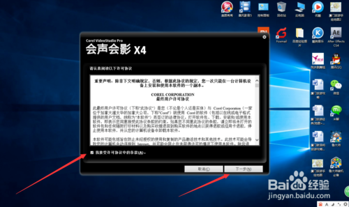 接著會彈出會聲會影.X4的安裝確認(rèn)界面,把“我接受許可協(xié)議中的條款”前面的方框打勾,然后單擊“下一步”。