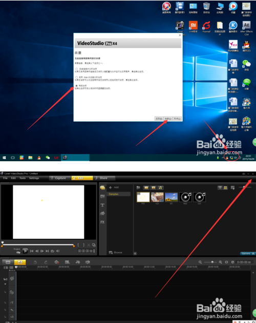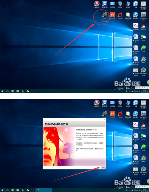 重啟后,雙擊桌面會聲會影.X4的快捷鍵運(yùn)行軟件,雙擊運(yùn)行時,會彈出試用30天的提示,直接點“繼續(xù)”就好。(因為會聲會影.X4只可以試用30天,如果你想永久使用,就得購買,或使用注冊機(jī)破解,在接下來的經(jīng)驗中我也會跟大家分享如何使用注冊機(jī))。