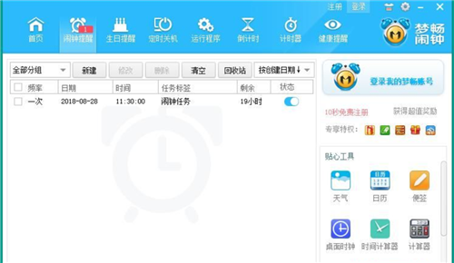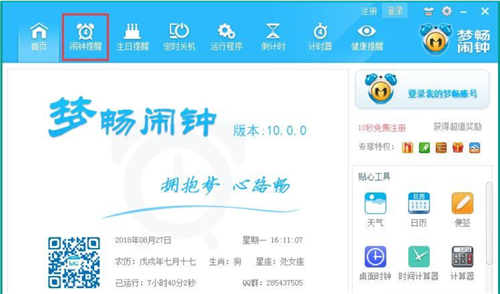 1、點(diǎn)擊夢暢電腦鬧鐘主界面功能欄中的鬧鐘提醒,打開鬧鐘管理窗口;