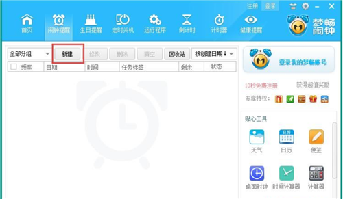 2、在夢暢電腦鬧鐘的鬧鐘管理窗口,點(diǎn)擊新建,就可以新建一個(gè)電腦鬧鐘;