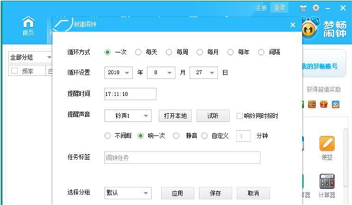 3、打開電腦鬧鐘新建界面。我們可以選擇設(shè)置鬧鐘的循環(huán)方式、循環(huán)日期、腦中時(shí)間、提醒聲音、響鈴方式、任務(wù)標(biāo)簽、鬧鐘分組;