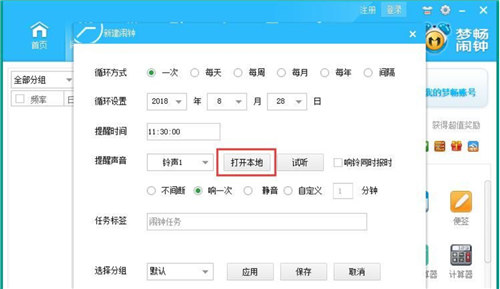 4、小編選擇了鬧鐘循環(huán)1次,在2018年8月18日的早上11:30響鈴。夢暢電腦鬧鐘有默認(rèn)的鬧鐘鈴聲,同時(shí)也支持我們自定義設(shè)置鬧鐘鈴聲。點(diǎn)擊打打開本地,打開文件瀏覽窗口,選擇想要用來作為鈴聲的音頻文件;