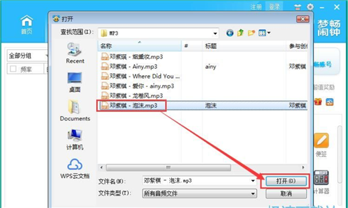 5、在文件瀏覽窗口中,根據(jù)MP3音頻文件的存放路徑,找到想要用作鬧鐘鈴聲的MP3音頻文件。點(diǎn)擊選中文件后點(diǎn)擊打開,就可以將選中的MP3音樂添加到夢暢電腦鬧鐘中作為鬧鐘鈴聲了;