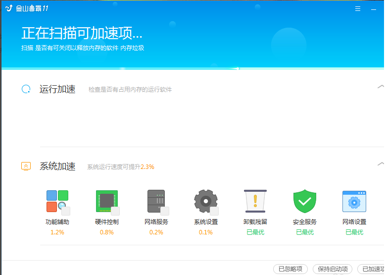 5、用戶使用電腦加速功能,金山毒霸軟件會掃描電腦中的可加速選項,如軟件的開機自啟、系統(tǒng)的一些輔助功能等都可以進(jìn)行優(yōu)化,掃描完成后用戶可以選擇勾選然后進(jìn)行優(yōu)化,使用電腦加速功能可以讓電腦快速的開機運行。