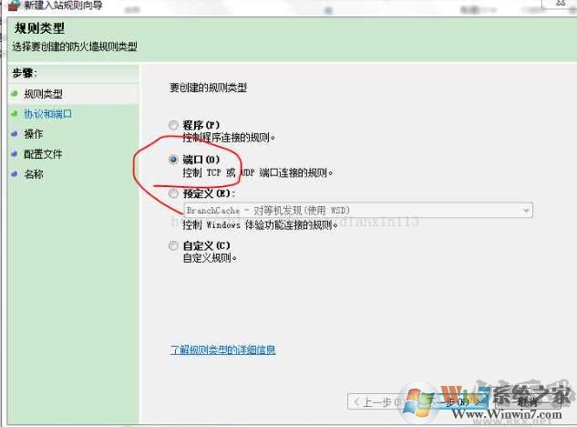 3、在要創(chuàng)建的規(guī)則中選擇“端口”。 點(diǎn)擊下一步。