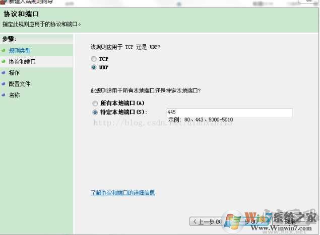 4、然后選擇UDP 再選擇特定本地端口,輸入要關(guān)閉的端口號 如 445 點(diǎn)擊下一步