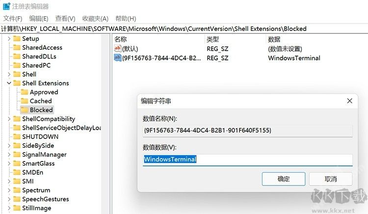 4、點(diǎn)擊選擇【Blocked】文件夾,右鍵新建字符串值,名稱為【{9F156763-7844-4DC4-B2B1-901F640F5155}】,數(shù)值為【WindowsTerminal】。