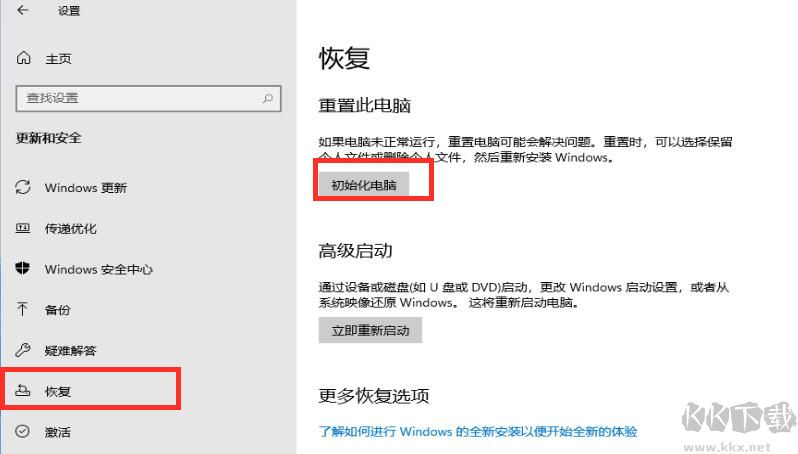 3、點(diǎn)擊左邊的【恢復(fù)】選項(xiàng)之后,在右側(cè)就可以看到重置此電腦的選項(xiàng)啦,點(diǎn)擊初始化電腦;