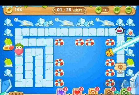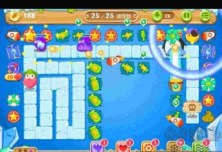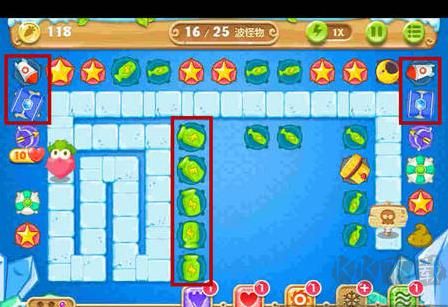 2、選擇升級(jí)的炮塔是很關(guān)鍵的,玩家在游戲的前期需要升級(jí)的有火箭炮和冰錐塔來保證小怪不會(huì)侵犯到蘿卜,同時(shí)為清除屏幕上的道具提供了保障。與此同時(shí)也要對(duì)中間的瓶子炮進(jìn)行升級(jí),才能有足夠的火力去消除怪物;