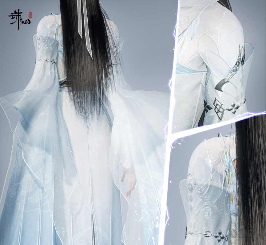 借助虛幻引擎的優(yōu)勢(shì),《誅仙世界》將多分層技術(shù)代入到服飾設(shè)計(jì)中,在還原各式面料材質(zhì)的基礎(chǔ)上,更將在設(shè)計(jì)中采用“立體式裁剪”技術(shù):與傳統(tǒng)游戲服飾設(shè)計(jì)中單純用大量繁瑣花紋圖案裝飾、復(fù)雜的配色等堆砌的方法不同,《誅仙世界》選擇借助服飾塑造剪影(廓形),而不是貼身包裹,從而達(dá)到自由造型凸顯性格的目的;同時(shí)使用翻折,對(duì)折等方式制造大量的褶皺來(lái)增加肌理層次、提升服飾的精致度和高級(jí)感。