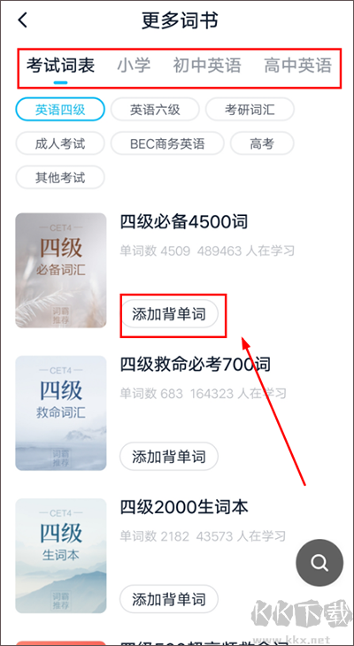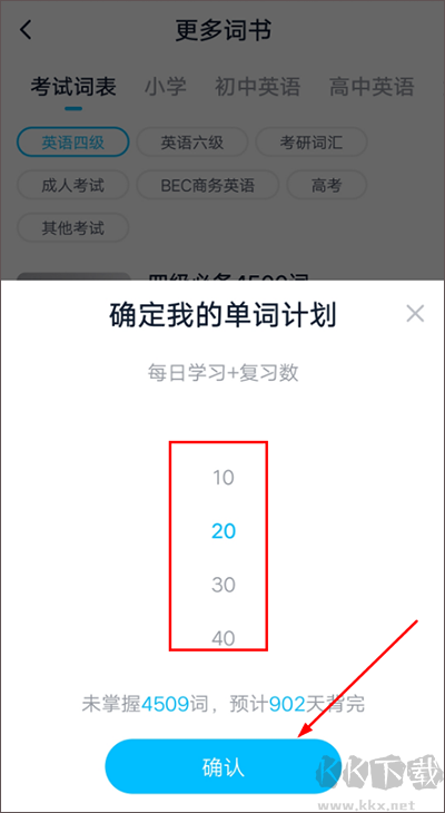 2、在【更多詞書】頁面內(nèi),根據(jù)自己的需求來選擇要背的單詞量