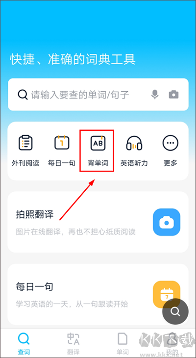 1、下載登錄金山詞霸app,點(diǎn)擊首頁的【背單詞】功能