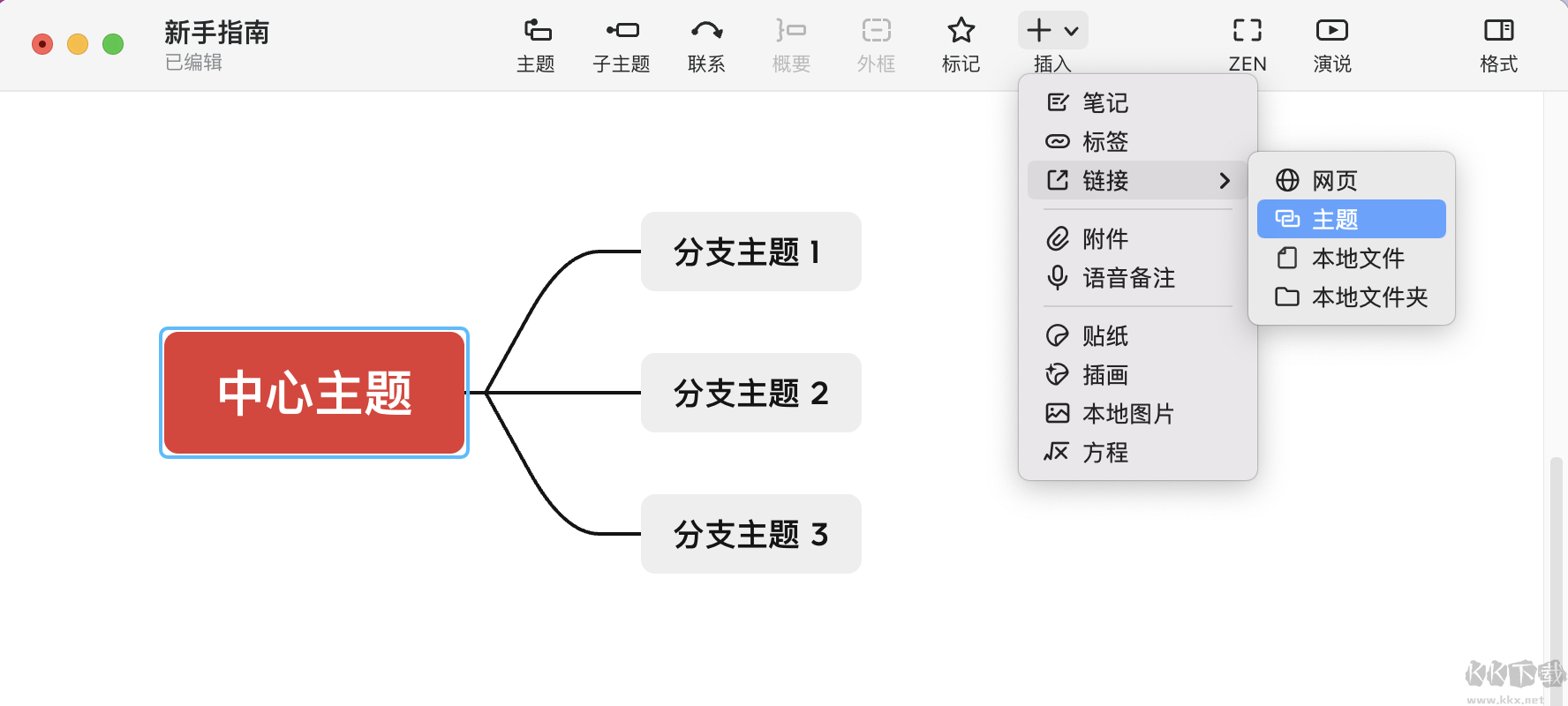 選中畫(huà)布中的一個(gè)主題,在工具欄的插入中選擇鏈接 > 主題,在彈出的窗口中選擇你想跳轉(zhuǎn)的目標(biāo)主題,點(diǎn)擊插入即可。