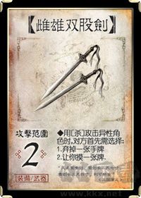 距離2,當你使用【殺】造成傷害時,你可以防止此傷害,改為棄置該目標角色的兩張牌(棄完第一張再棄第二張)。這讓魏國自殘流以及小喬一干人等無比的抑郁,這就是想賣血都賣不成的悲劇- -這把武器說的容易點就是你殺對方時可以先詢問是否命中,得到肯定答復后,可以有傷害其1點體力的另一種方式,即對其使用2張【過河拆橋】,可以對其手牌和裝備牌任意的拆遷,常見作用有是防止司馬的反饋以及幫助隊友拆掉敵人的裝備比如八卦+1馬啥的。