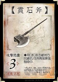 許褚神器,憋牌幾輪就是為了這把武器的強制命中,當然同樣可以作為【諸葛連弩】攻擊的前奏,手牌多的武將用起來很不錯,尤其對方覺得自己有閃有八卦正美的鼻涕冒泡的時候,不要想了,把自己多余要棄掉的手牌扔掉,變廢為寶,化作一記重擊,連著鼻涕泡把鼻血一起打出來。孫尚香使用貫石斧時,可以棄掉自己的馬摸牌。
