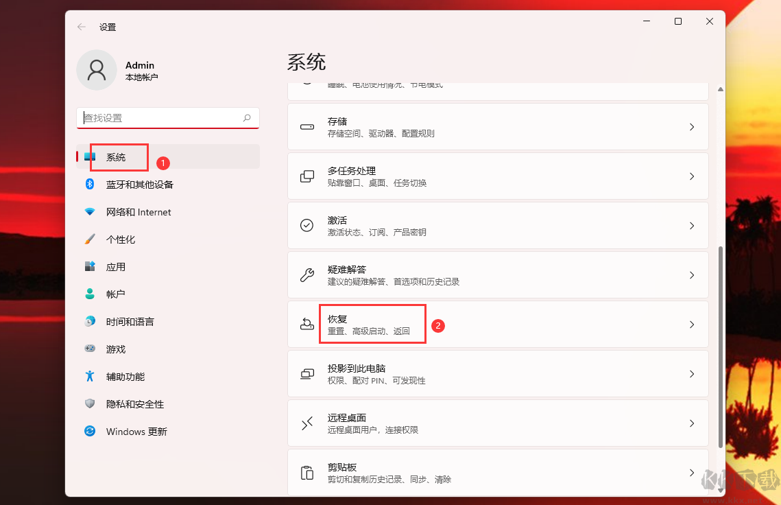 2、在設(shè)置界面的左側(cè)選擇“系統(tǒng)”,點(diǎn)擊“恢復(fù)”選項(xiàng)。