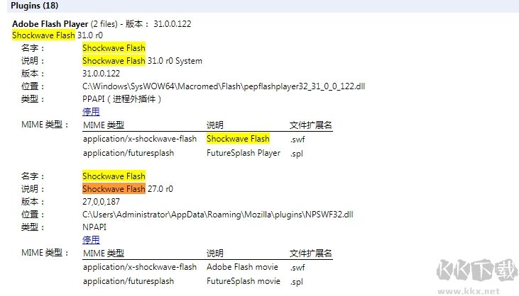1、在瀏覽器地址欄打開se://plugins頁面后,在Adobe Flash Player 或者shockwave flash里找到路徑有\(zhòng)360se\的兩個flash版本,一個是PP,一個是NP。