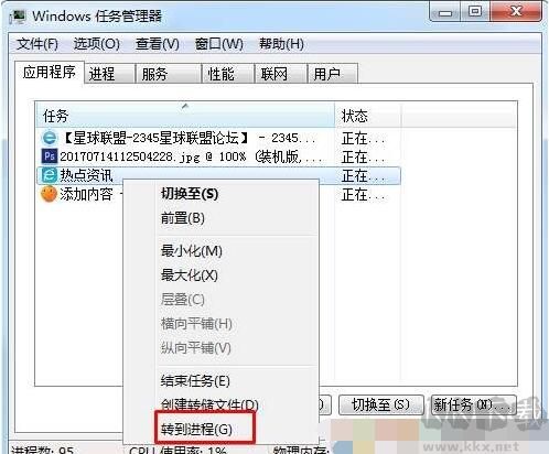 2、這時我們可以打開任務(wù)管理器,然后右鍵點擊“熱點資訊”,再選擇“轉(zhuǎn)移到進程”;