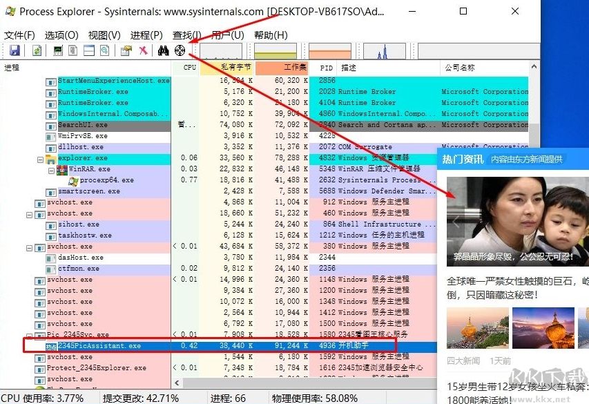 2、如下圖,我們打開進程查看器,點擊定位圖標(biāo),然后移動到廣告上面,就可以看到定位到進程:2345PicAssistant.exe ;