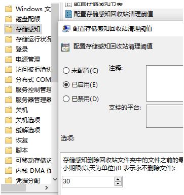在開始菜單或者運行中輸入 gpedit.msc 打開組策略編輯器,展開 計算機配置 - 管理模板 - 系統(tǒng),找到存儲感知,選中后在右邊找到“配置存儲感知回收站清理閾值”。