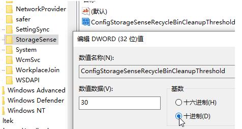 右鍵點擊StorageSense,新建 - DWORD(32位)值,命名為ConfigStorageSenseRecycleBinCleanupThreshold,右鍵點擊選擇修改,或者雙擊,切換“基數(shù)”為十進制,然后填入天數(shù),同樣最大只能365。
