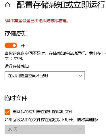 經(jīng)過此設(shè)置后,設(shè)置中的存儲感知頁面會提示“其中某些設(shè)置已由組織隱藏或管理”,并且無法在這里更改天數(shù)。