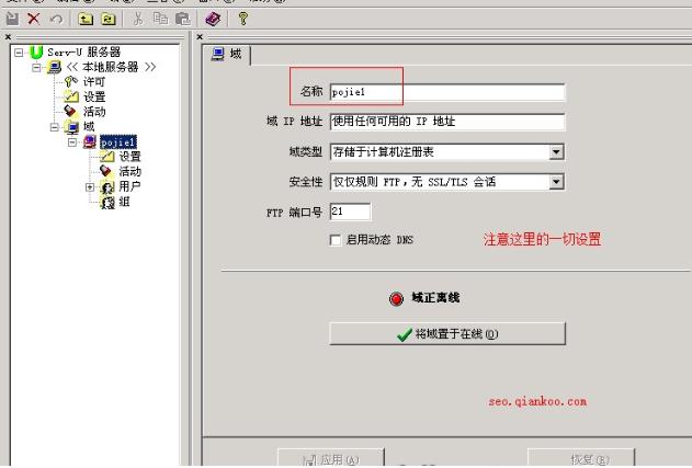 通過上面的操作之后,就可以讓Serv-u正常運(yùn)行了,當(dāng)然大家也可以嘗試把FTP端口號改成不同的,如Serv-U用21,IIS 的FTP改成2121.這樣的效果是一樣的。