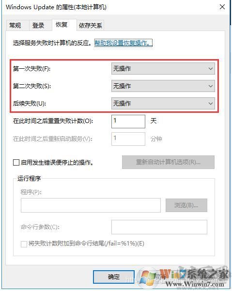 3、切換到恢復(fù)選項卡,在“恢復(fù)”欄中,將“第一次失敗”“第二次失敗”“后續(xù)失敗”后的下拉選項框均改為“無操作”,點擊“確定”。(這項不改的話,這個服務(wù)會自動修復(fù)啟動的哦。)