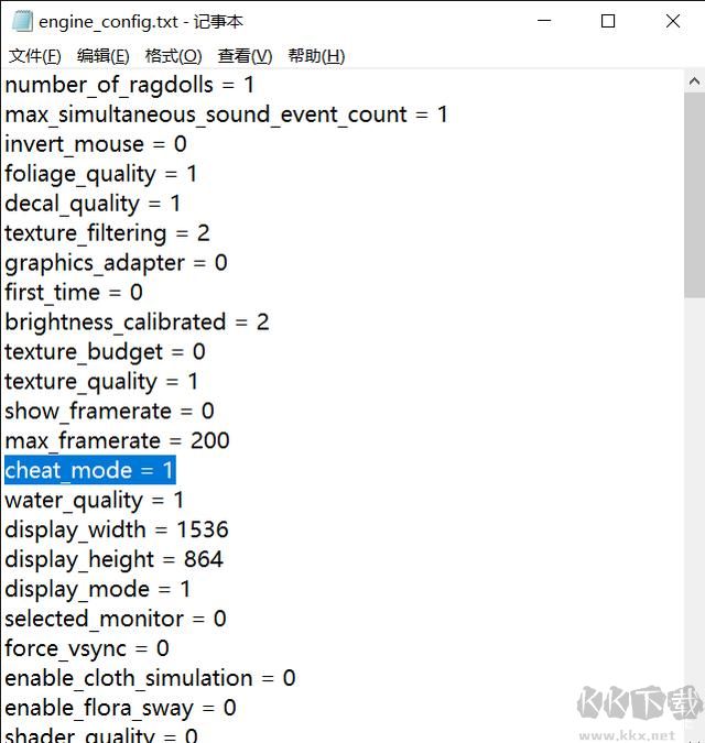 最后在engine_config的文本中找到 cheat_mode = 0 這條數(shù)據(jù),將0改為1,再次進(jìn)入游戲,就會(huì)發(fā)現(xiàn)游戲的作弊模式已經(jīng)啟動(dòng)啦~
